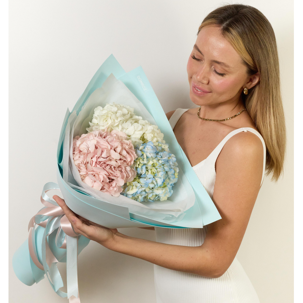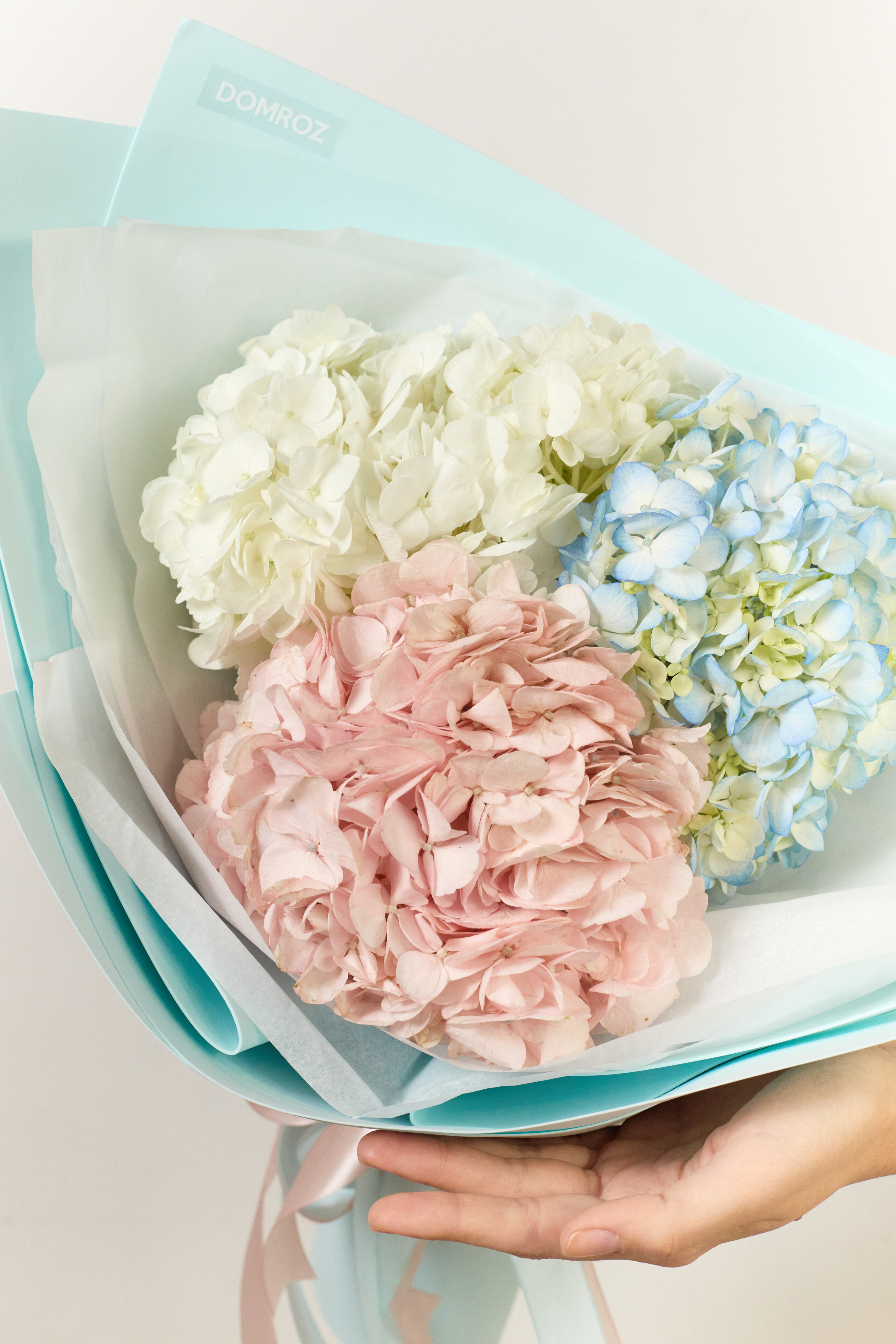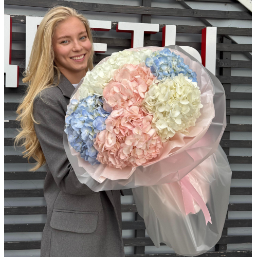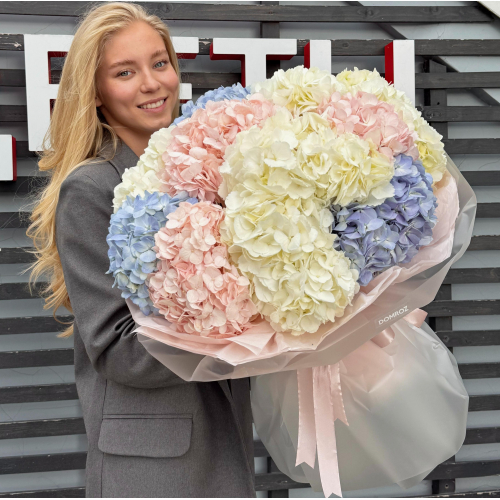Фото является примером. Букет собирается из гортензий разных оттенков, и собранный букет может отличаться по цветовой гамме от первоначального фото.