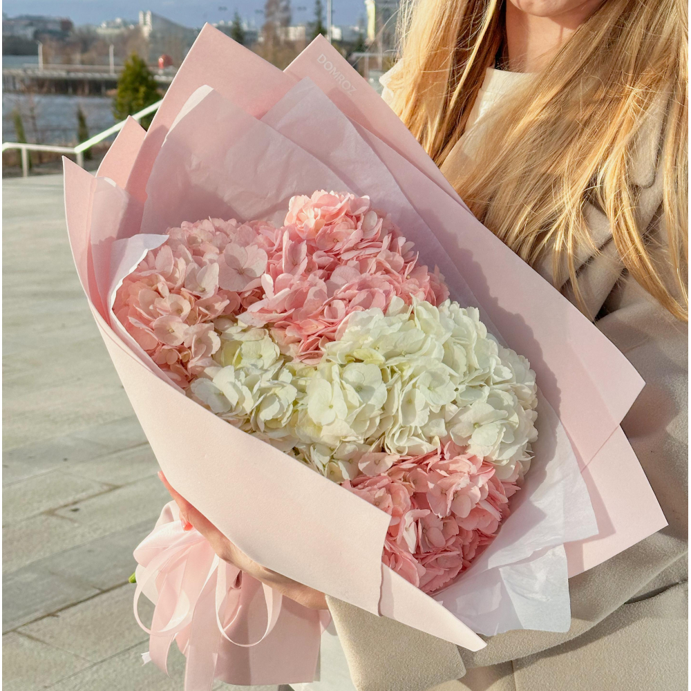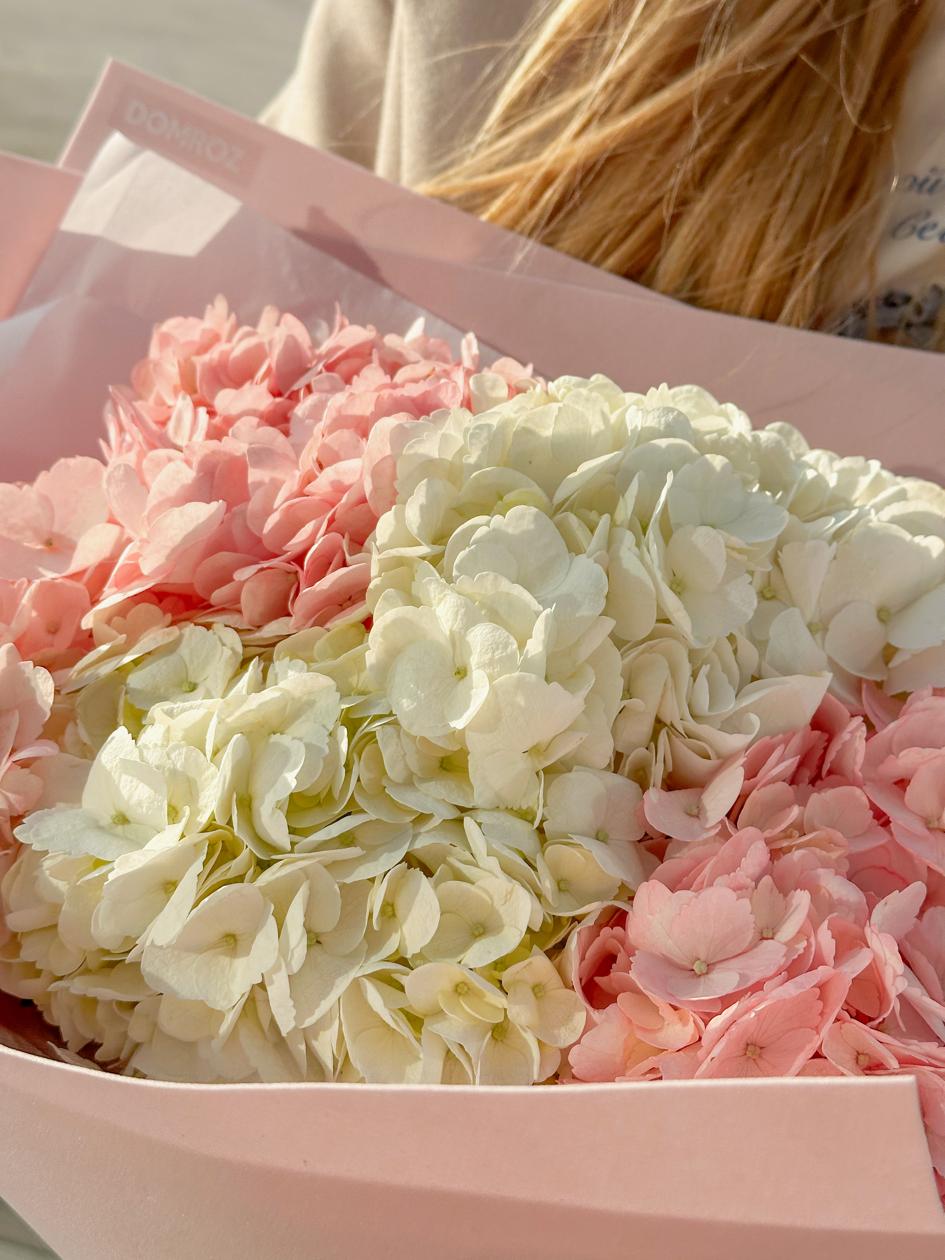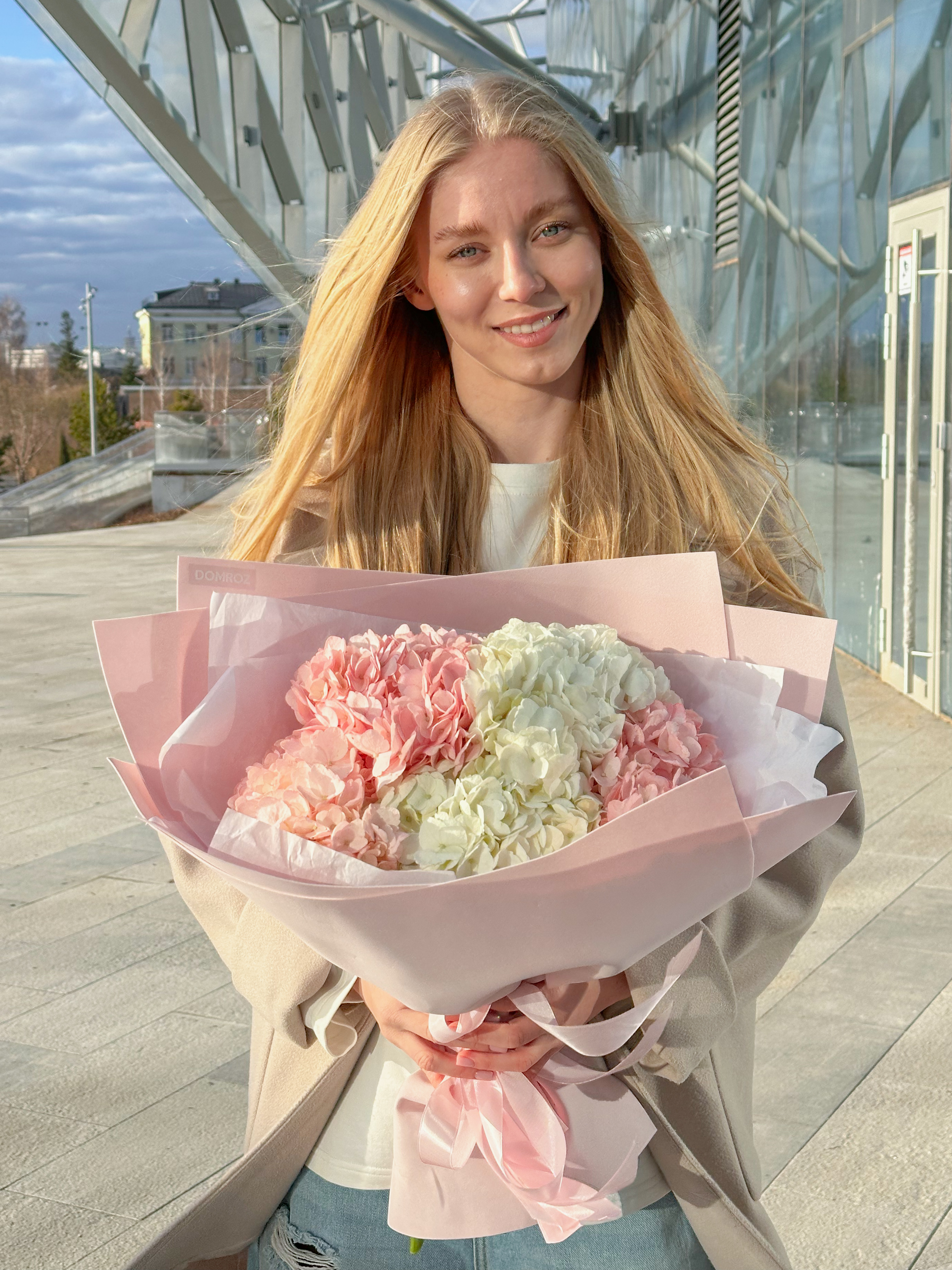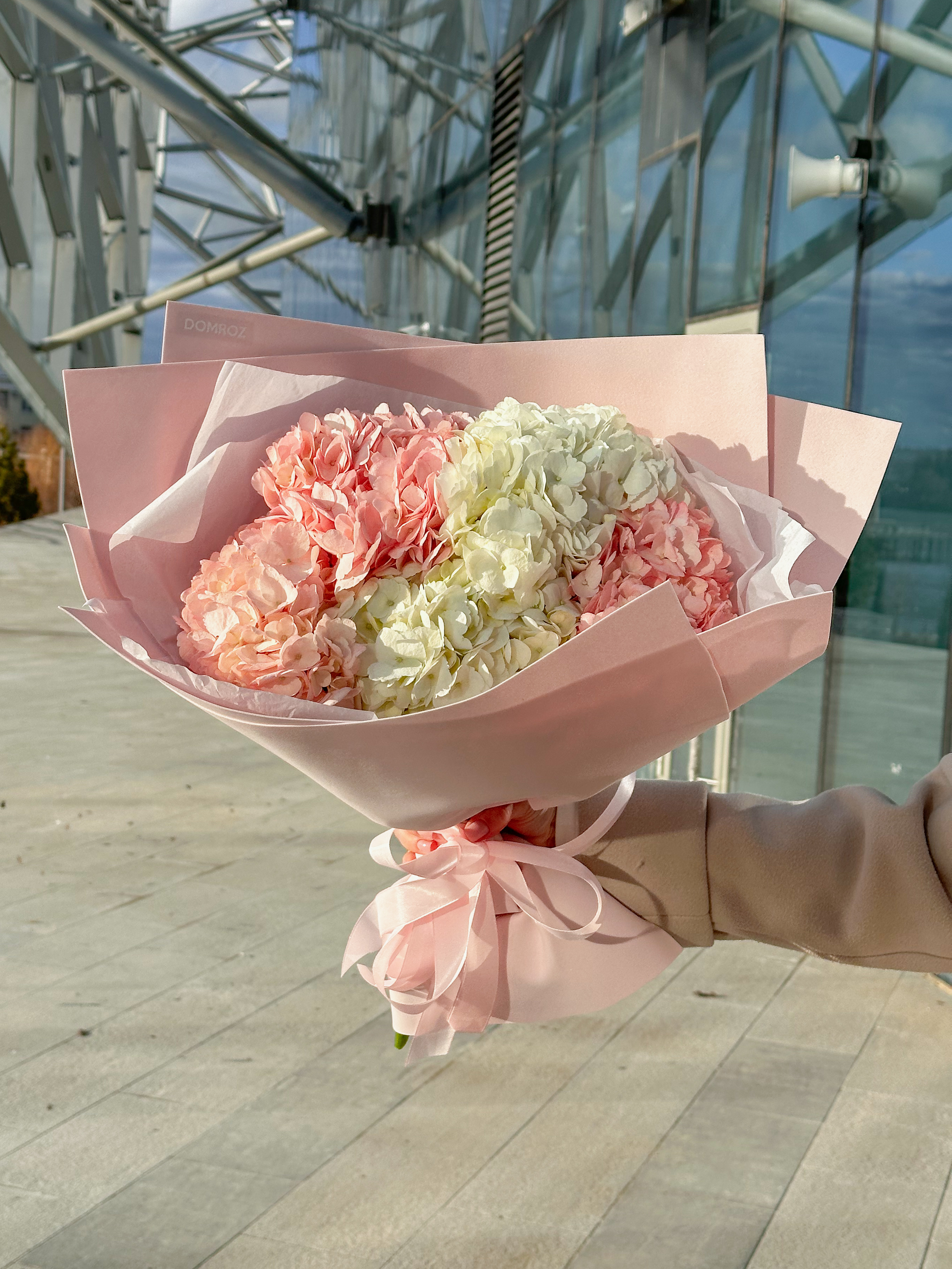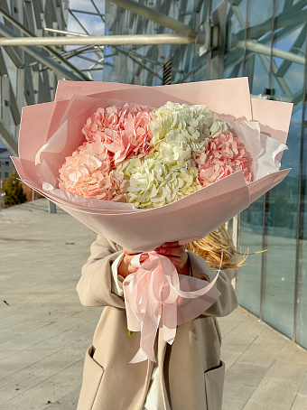 Фото является примером. Букет собирается из гортензий разных оттенков, и собранный букет может отличаться по цветовой гамме от первоначального фото.