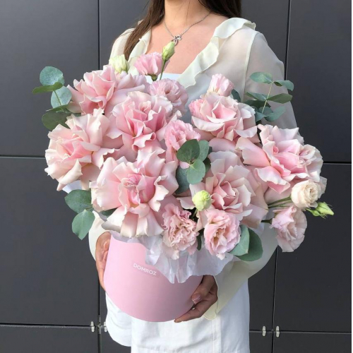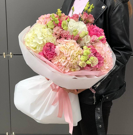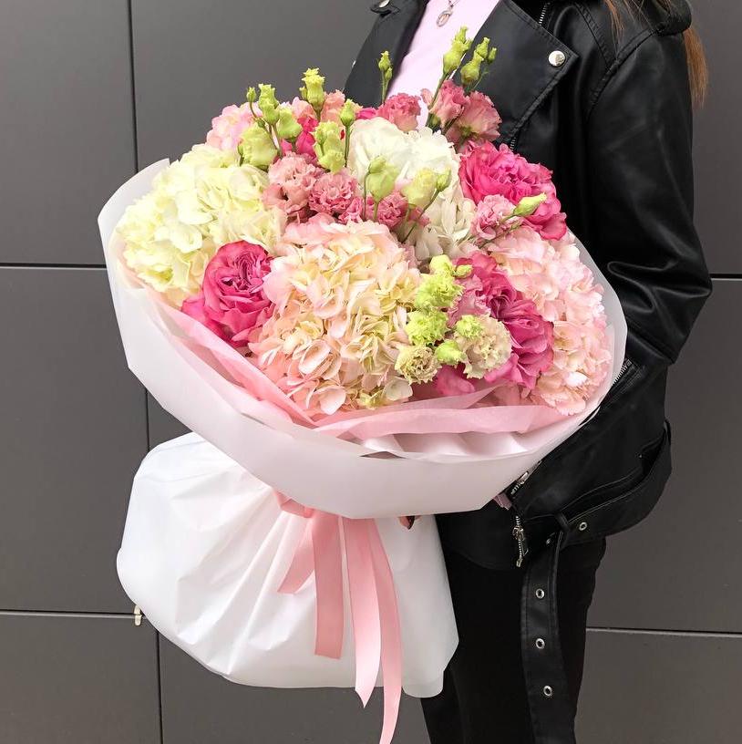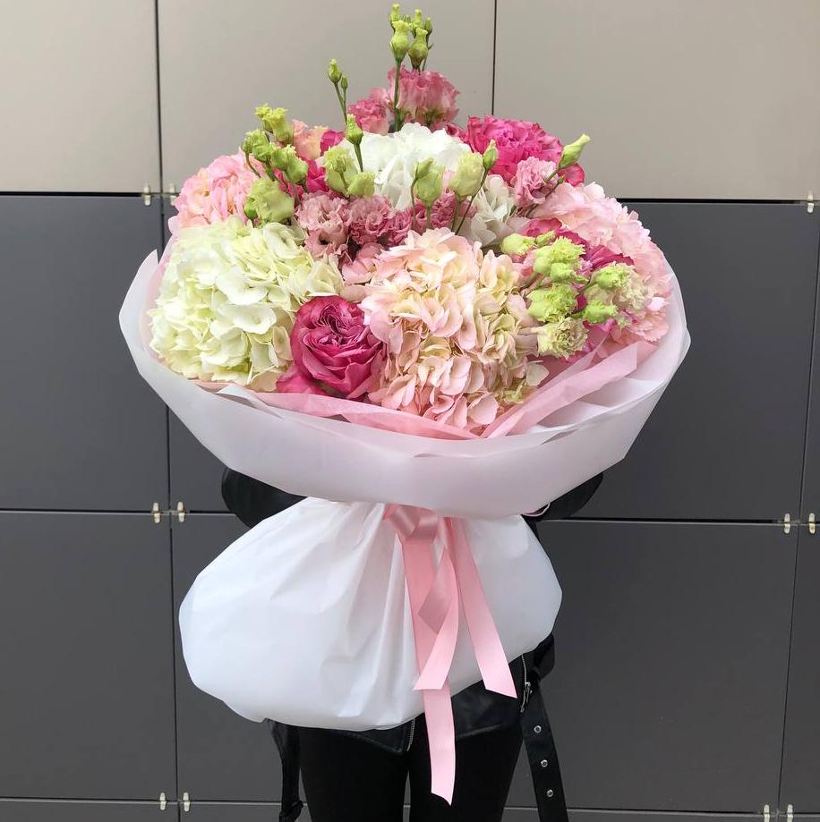 Букет с гортензиями розами и эустомой