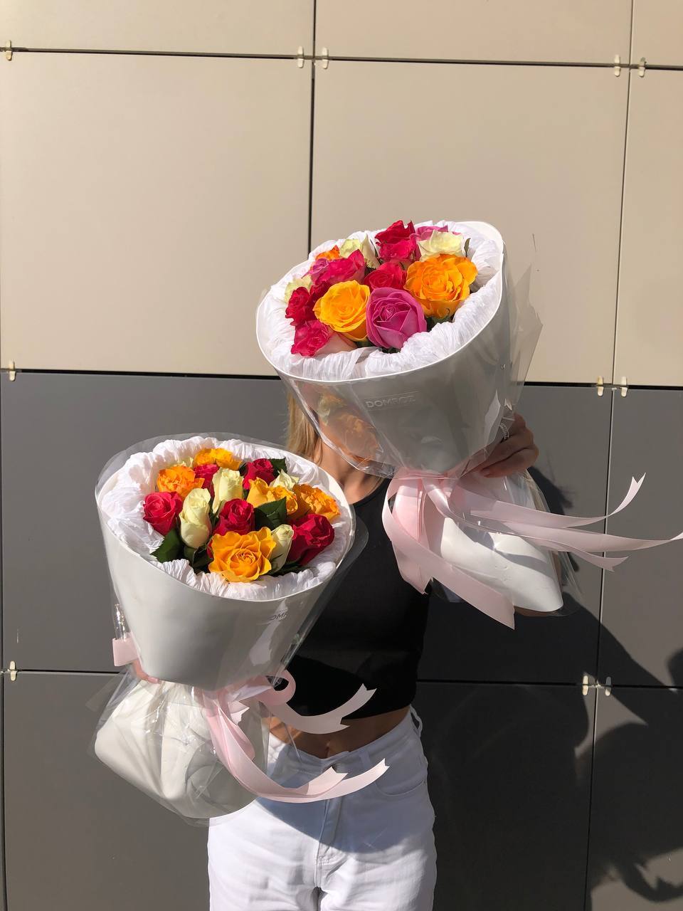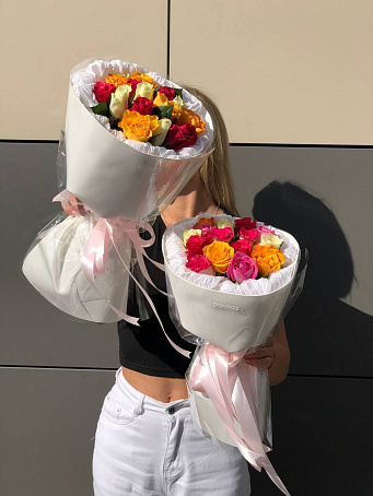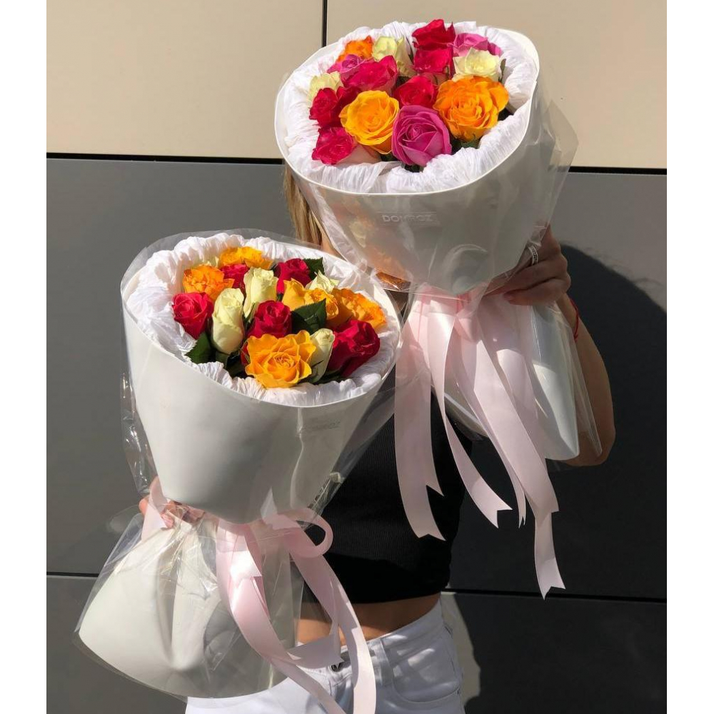Фото является примером. Букет собирается из роз разных оттенков, и собранный букет может отличаться по цветовой гамме от первоначального фото.